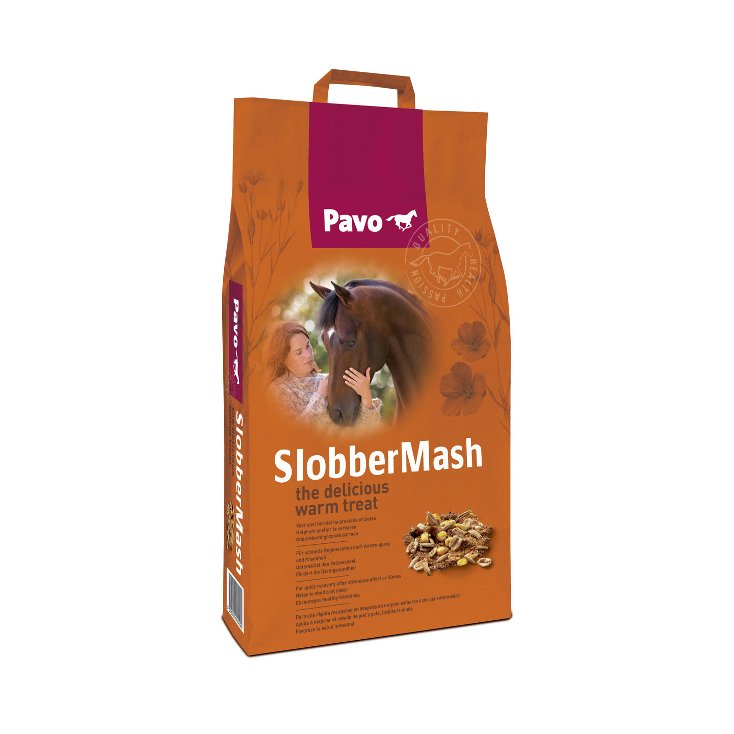 Pavo SlobberMash is een compleet krachtvoer dat je eenvoudig en snel met warm water klaarmaakt. Door het hoge aandeel zuiver lijnzaad krijgt je paard een schitterende glans. Het ondersteunt een goede darmwerking en gezonde vertering.