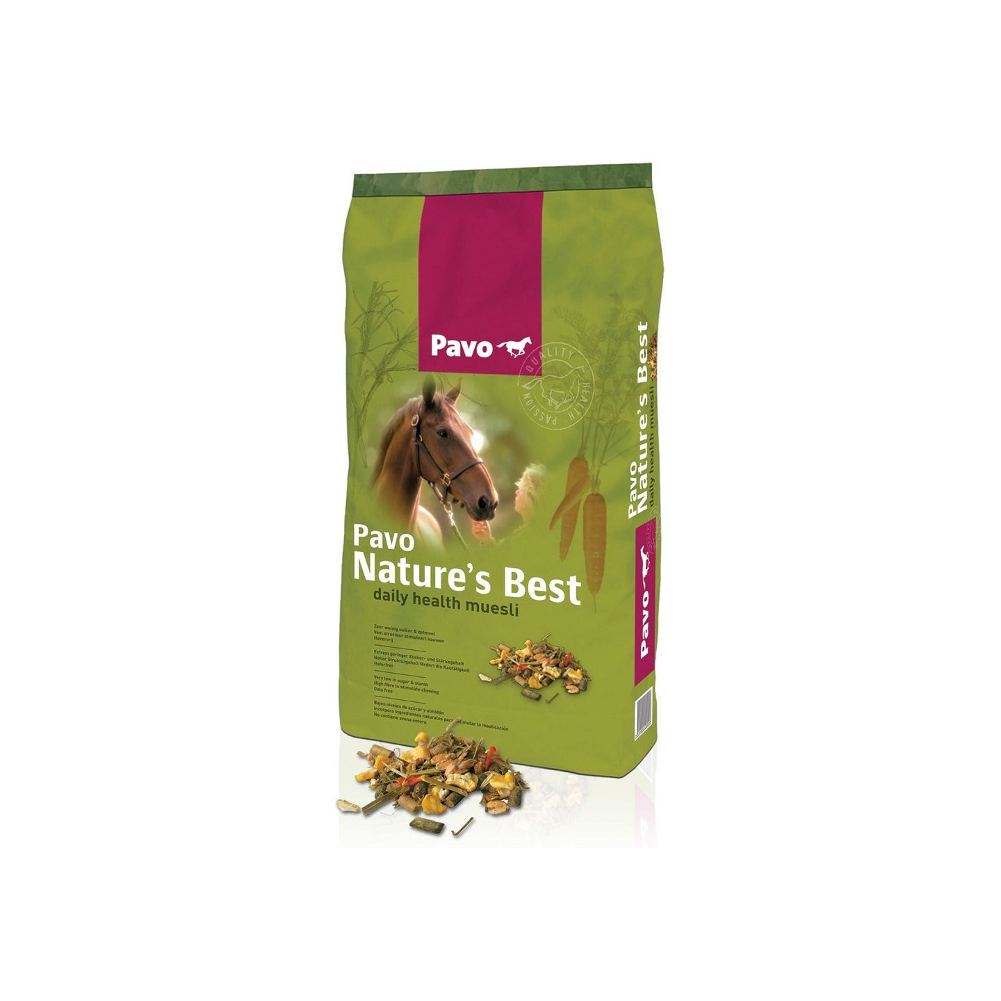 Pavo Nature's Best is een heerlijke, gezonde, structuurrijke muesli, speciaal ontwikkeld voor recreatie- en sportpaarden die lichte arbeid verrichten. Het bevat spelt en timothee en een zeer laag suiker/zetmeelgehalte. Timothee is een vezelrijke grasplant met een heerlijke kruidenachtige geur. In vergelijking met grassoorten, zoals Engels Raaigras heeft timothee een laag suikergehalte. Met name de fructanen zijn relatief laag. De vitaminering in Pavo Nature's Best is volgens de laatste inzichten en gebaseerd op de gemiddelde waarden in het hedendaagse ruwvoer.
