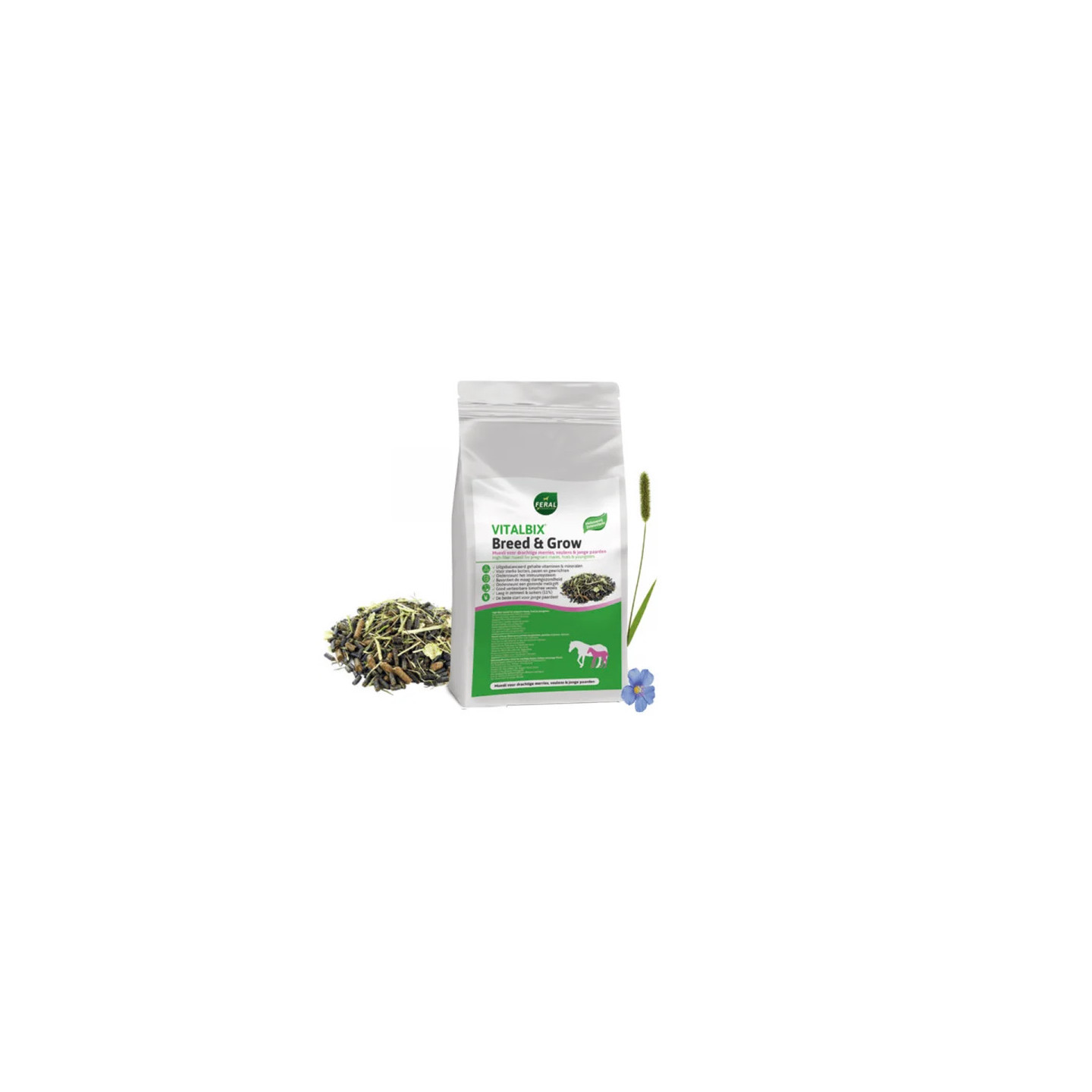 Vitalbix Breed & Grow is een unieke, vezelrijke muesli samengesteld volgens de laatste inzichten op het gebied van voeding voor drachtige merries, veulens, jonge paarden (tot ca. 3 jaar) en dekhengsten. Breed & Grow is rijk aan vezels, laag in zetmeel & suikers en bevat een uitgebalanceerd gehalte goed opneembare vitaminen, mineralen en sporenelementen.